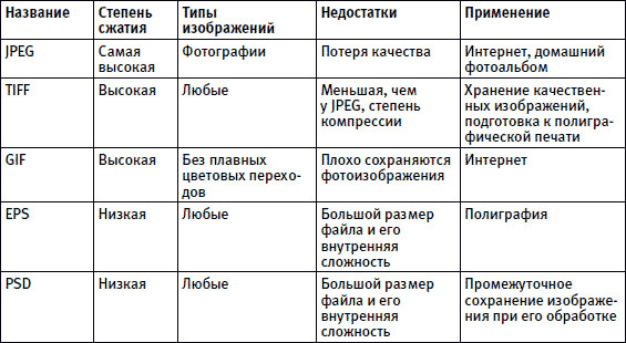 В большинстве случаев рекомендуем использовать JPEG и TIFF, иногда – GIF. Особенности описанных выше форматов приведены в табл. 1.1.