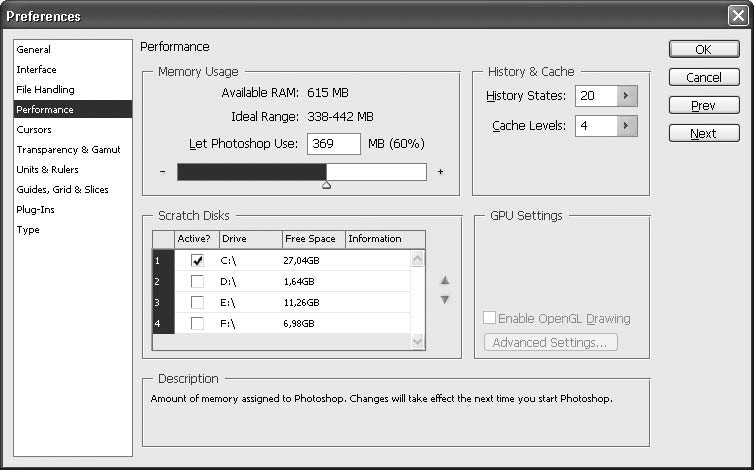 Обратите внимание и на полеHistory States (Шаги истории). С помощью палитрыHistory (История) можно отменять несколько последних операций. Увеличение значенияHistory States (Шаги истории) сделает работу более комфортной, но потребует дополнительных затрат оперативной памяти. Если вы замечаете, что компьютер начинает «притормаживать» при долгом редактировании одного изображения, уменьшите количество шагов истории.
