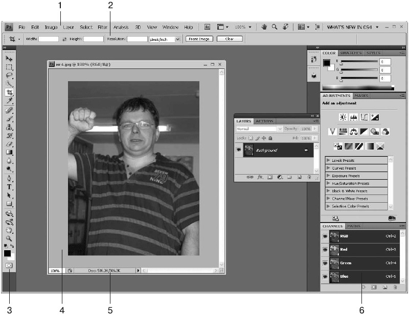 1. Меню программы. Здесь собраны команды Photoshop. Многие из них имеют клавиатурные эквиваленты. Рекомендуем выучить хотя бы самые необходимые. Гораздо легче нажать, например,Ctrl+I, чем отыскать в меню пункт Image → Adjustments → Invert (Изображение → Коррекция → Инвертировать).