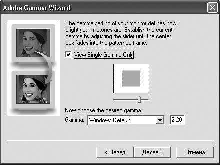 Для этого служит, например, небольшая, но очень удобная программа Adobe Gamma. В крайнем случае воспользуйтесь утилитой калибровки, которая обычно устанавливается вместе с драйвером видеосистемы. Для этого откройте окно свойств экрана (с помощью меню Пуск → Настройка → Панель управления →Экран),перейдите в нем на вкладкуПараметры и нажмите кнопкуДополнительно. Откроется окно с несколькими вкладками. Их названия зависят от того, какие драйверы видеокарты установлены. Найдите такую, в названии которой есть слова Gamma, Calibrate, Управление цветом или что-то подобное. Скорее всего, вы получите возможность настроить цвет с помощью оригинальной разработки компании – создателя видеокарты. Принцип действия везде похожий (мы рассмотрим его на примере Adobe Gamma), а вот интерфейс может заметно различаться.