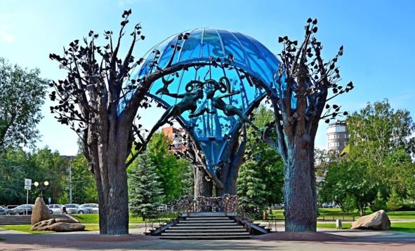 Рядом расположен не менее забавный памятник «Мяч в кепке». Вы ни за что не догадаетесь, кому он посвящён! Помните, я упоминала о челябинском мэре Вячеславе Тарасове, которому принадлежала идея создания Кировки, как пешеходного культурного объекта? Вячеслав Михайлович в своё время ещё прославился тем, что активно пропагандировал развитие спорта в Челябинске. И, совершая визиты в учебные заведения, имел привычку дарить баскетбольные мячи. Этот факт стал городским анекдотом про мэра и баскетбольный мяч, как две неотъемлемые части одного целого.