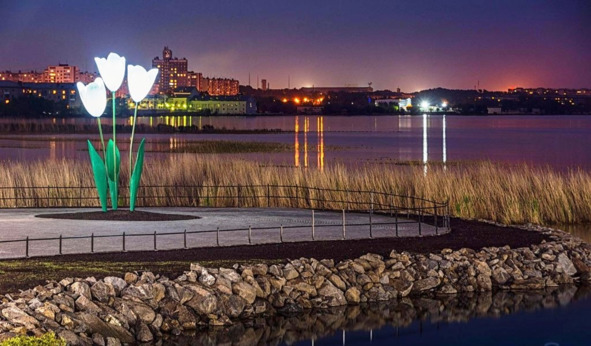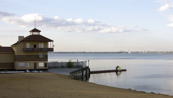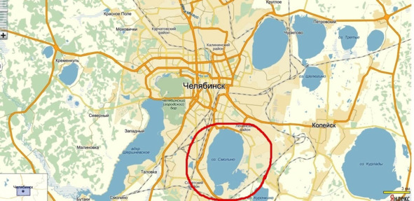 А на противоположном берегу, вы без труда обнаружите огромный купол челябинского торгового центра.