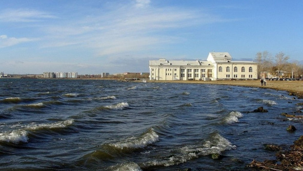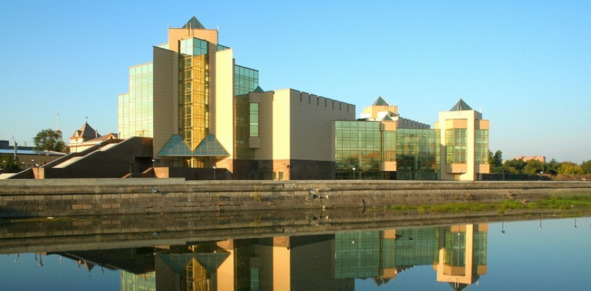 Вдалеке слева на берегу красивое современное здание из стекла и мраморной плитки с конусными крышами — Челябинский областной краеведческий музей. В других городах краеведческий музей размещается в каком-нибудь старом историческом здании. Челябинский музей уникален тем, что это единственное (!) в России здание краеведческого музея, выстроенное в 1990-ых годах, то есть уже в период Российской Федерации.