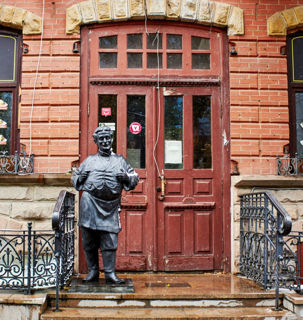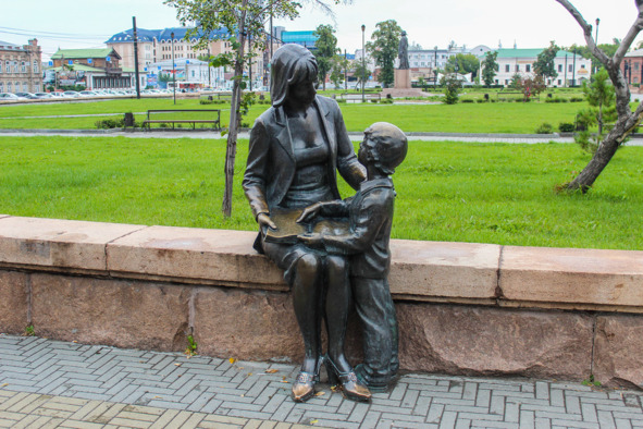 И последняя скульптура малой формы на Кировке — это женщина с мальчиком, читающая книгу. Все дают ей разные названия: «Первая учительница», «Мама и сын». Установлена она была в этом месте, как и многие другие скульптуры на Кировке, по принадлежности к ближайшему архитектурному объекту. В доме напротив очень долгое время размещался один из любимых горожанами книжный магазин! Поэтому и женщина с книгой. Но вот совсем недавно магазин книг «выжили» с этой территории. И теперь помещение арендуют иные структуры. Поэтому и нахождение скульптуры здесь вроде бы неоправданно. Но, с другой стороны, она напоминает о бывшем книжном магазине и любви челябинцев к чтению. Кстати, по недавней статистике выявлено, что Челябинск входит в «восьмёрку» самых читающих городов России!