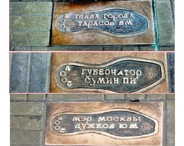 А ещё, если вы внимательно приглядитесь, то увидите под ногами бронзовые памятные «следы», на которых написаны имена Вячеслава Тарасова, губернатора Петра Сумина и Юрия Лужкова.