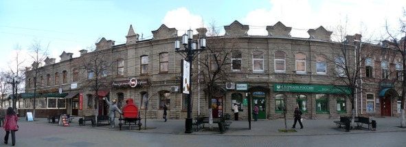 Величественные, сложенные из серого камня дома на углу у площади Ярославского, почти в конце пешеходной улицы Кировки — бывшие дома купца Андрея Петровича Холодова, выстроенные под доходные дома и магазины.