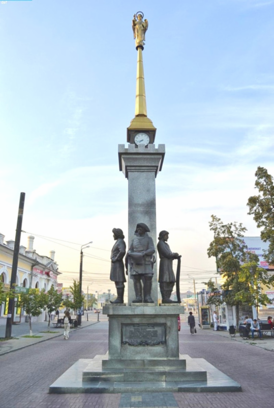 Стелу венчает фигурка архангела Михаила. А основание украшает композиция из четырёх бронзовых фигур: казак с пикой, башкир, крестьянин с пилой и офицер. Под фигурами установлены бронзовые доски с выдержками из архивных документов первых поселенцев крепости.