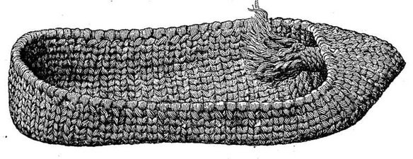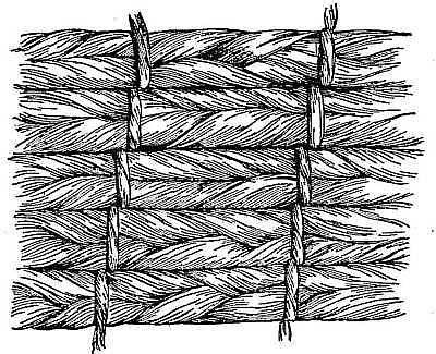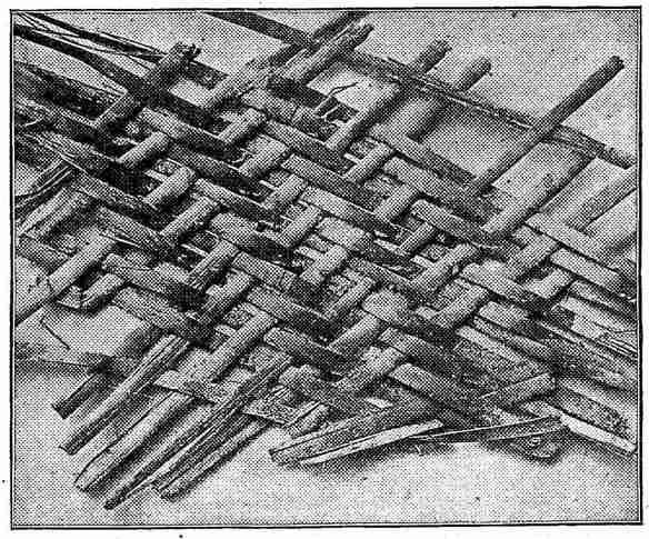 Products of the textile art: a, Openwork fish baskets of Virginia Indians; b, Manner of weaving: c, Basket strainer; d, Quiver of rushes; e, Mat of rushes