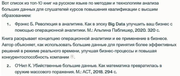 Просматриваем ответ. Пункт первый: «Революция в аналитике». Здесь идёт абзац текста с пояснением, о чём эта книга. И далее идет ссылка, очень похожая на требования стандарта. Здесь может быть указано количество страниц. Или не указано — в зависимости от