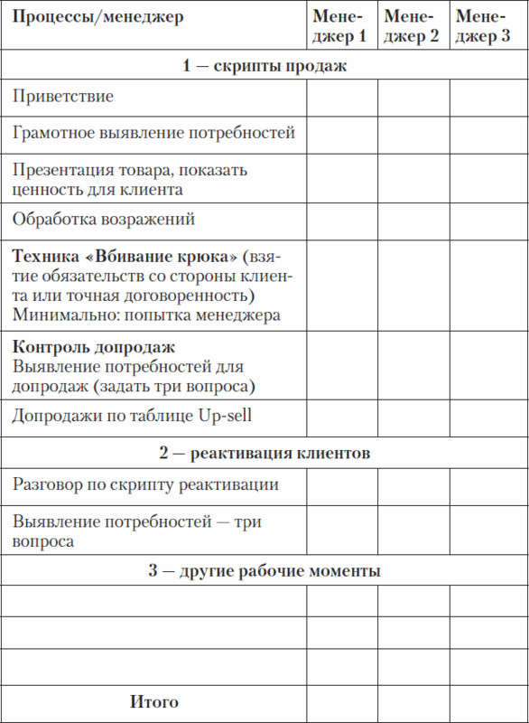 Чек-лист эффективности телефонных звонков – это таблица, аккумулирующая информацию об эффективности работы менеджеров и руководителя отдела продаж. Ее пример представлен в табл. 0.1.