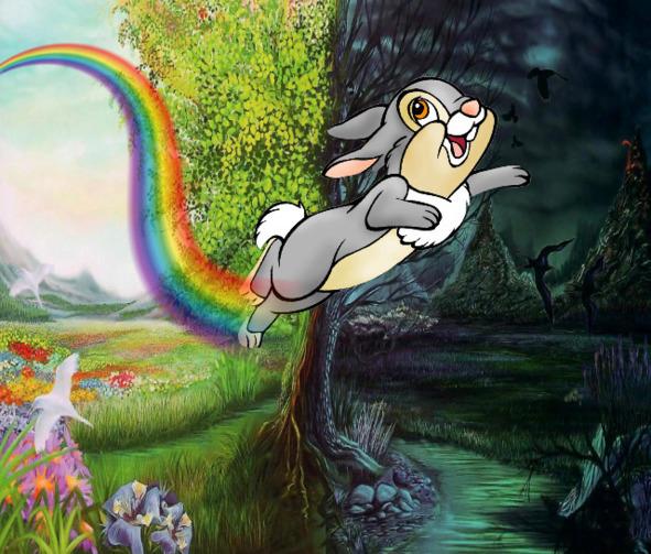— Этот кролик бегает по городу, где царит зло, и его радужный след, делает всех добрыми. Как думаешь, существует такой кролик?