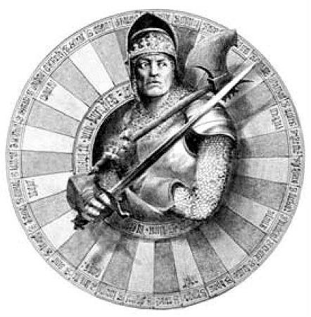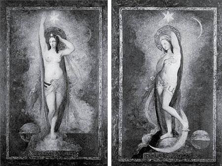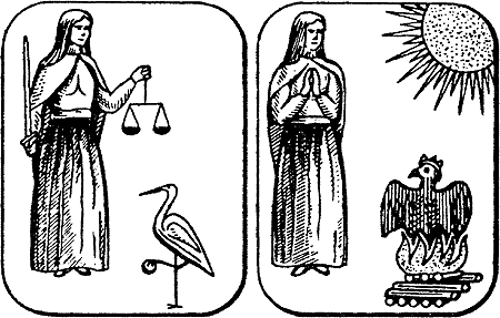 Атрибуты аллегорий: а. Аллегория правосудия с атрибутами — мечом, весами и цаплей, держащей камень; б. Аллегория надежды с атрибутами — сложенными в мольбе руками, Солнцем и птицей Феникс.