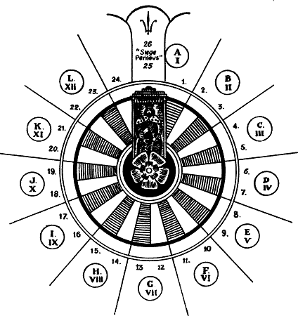 ЕВРЕЙСКИЕ БУКВЫ ПО СЕФЕР ЙЕЦИРА. В центральном треугольнике расположены три Материнские Буквы, из которых возникли семь Двойных Букв — планеты и небеса. Окружающие черную звезду являются знаками Зодиака, которые символизируются двенадцатью Простыми Буквами. В середине этой звезды расположен Невидимый Трон Древнейшего из Древнейших — Верховного Неопределимого Творца.