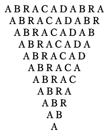 Магическая формула, представляющая собой в «материальном» виде перевернутый треугольник, в который слово «абракадабра» (от древнееврейского abrtg ashabra — «(мечи) молнию и в смерти») вписывалось, начиная с верха; при перемещении вниз слово всякий раз усекалось на одну букву; заканчивался треугольник одной буквой «а». Считалось, что это заклинание, нанесенное на амулет, способно исцелить от болезни, особенно от лихорадки.