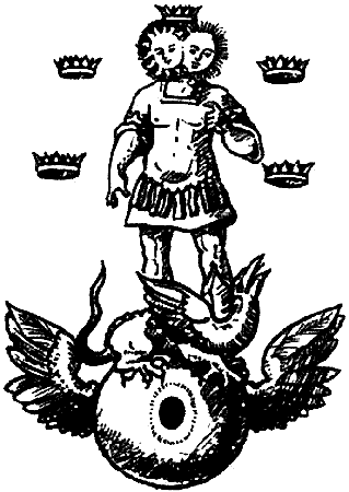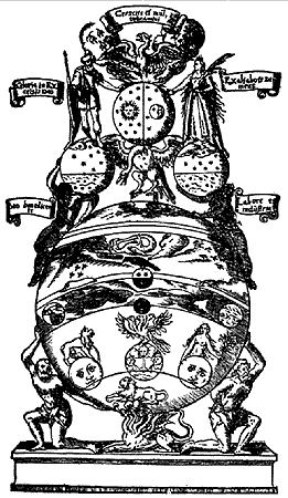 Из книги А. Либавиуса «Алхимия». АЛЛЕГОРИЧЕСКАЯ ГРАВЮРА, ПРЕДСТАВЛЯЮЩАЯ ТРИ СТАДИИ АЛХИМИЧЕСКОГО ПРОЦЕССА. В «первом Делании» (нижняя сфера) первовещество полностью очищается с помощью серии перегонок и проходит через «объединяющие врата гниения». Во «втором Делании» (три верхних сферы) происходит постоянная фиксация вещества. Лебедь символизирует «лунную тинктуру» (или «белый эликсир»). «Третье Делание» начинается с «философского брака» Короля и Королевы (Серы и Меркурия); на этой стадии рождается Феникс, называемый также «солнечной тинктурой» или «красным эликсиром».
