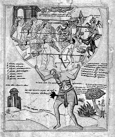 Грехи Адамовы. Русский лубок. Символическое изображение низа (земли под ногами Адама, олицетворяющего собой человеческий род) и верха, представленного небесной сферой, где ангелы сражаются с бесами за человеческие души, отягощенные бременем грехов.