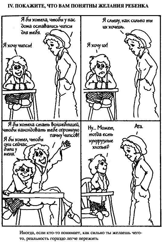 Следующие несколько недель я старалась настроиться на то, что мои дети могли, по моему мнению, испытывать, и когда я это сделала, мои слова, казалось бы, стали естественными. Я не просто использовала технические приемы. Я действительно имела в виду то, что говорила: «Так, значит, ты все еще чувствуешь себя уставшим, несмотря на то что ты только что дремал». Или: «Мне холодно, но тебе здесь жарко». Или: «Я вижу, тебя не особо интересует эта телепрограмма». В конечном счете мы были двумя разными людьми, способными иметь два разных набора чувств. Никто из нас не был прав или не прав. Каждый из нас чувствовал то, что чувствовал.