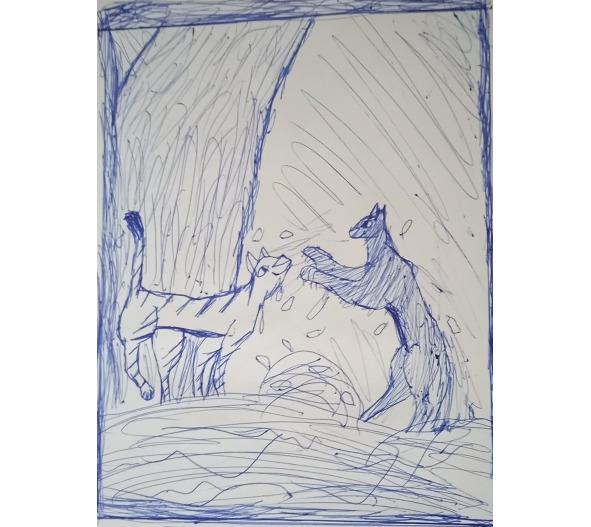 Веста подняла лапу и выпустила когти. Она была полосатой кошкой. Темный кот Брин поднял хвост и уклонился от удара. Он прыгнул на противницу и повалил ее. Но та встала и нанесла новый удар, очень легкий. Брин упал. — Эй! Больно! — закричал он.