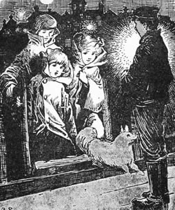 One day the prisoners of Fairy Island had been gayer than usual, but at last, tired and happy, they had lain down to rest. It might have been about midnight when they were awakened by a warning growl from Briton. Then, with Veevee, he sprang up and rushed to the gate barking furiously.