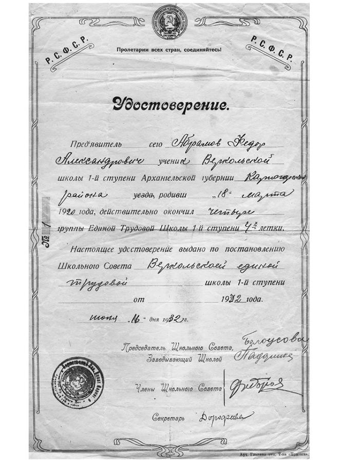 16 июня 1932 года двенадцатилетний выпускник Федя Абрамов держал в руках свой первый документ об образовании — «Удостоверение № 1» об окончании Единой трудовой школы 1-й ступени. Желание учиться дальше брало верх, но школы 2-й ступени в Верколе ещё не было.