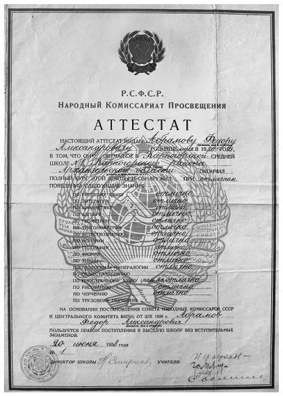 Почётная грамота № 7 от 9 июня 1935 года, выданная Феде Абрамову «за отличные успехи в учебной работе и примерное поведение, достойное советского школьника», ещё раз подчёркивала старания и желание учиться. И всё же его «середнячество» документально и тут не будет утеряно — в справке № 7/1206 от 12 июня 1935 года, выданной председателем Веркольского сельского совета, необходимой для поступления в техникум для продолжения учёбы, опять-таки будет значиться: