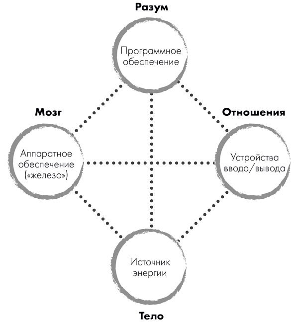 Основной квадрант — тело. Удовлетворяя все потребности тела и обеспечивая его достаточным количеством энергии, мы поддерживаем не только физическое здоровье, но и здоровье мозга, что необходимо для принятия решений, креативности и способности понимать свои эмоции и управлять ими. Кроме того, когда все потребности тела удовлетворены в полной мере, у нас достаточно сил и энергии, чтобы наслаждаться жизнью, заниматься любимым делом и искать новые приключения.