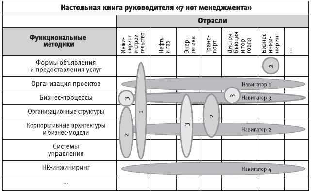 Навигатор – это и вся серия в целом, построенная в соответствии с едиными навигационными принципами. Навигатор – это и каждая книга серии (модуль), освещающая ту или иную тему. И наконец, навигатор – это отдельно взятый конечный элемент книги (разворот) – самодостаточный информационный носитель, снабженный системой операционных и тематических координат, позволяющий читателю не забывать, на какой широте и долготе единого информационного поля экономики он в данный момент находится. Это поле можно представить в виде таблицы (рис. 0.0.3), в которой столбцам соответствуют отраслевые практики, строкам – функциональные методики. При этом базовой, отражающей общие для модульной программы принципы организации, универсальные структурообразующие и методологические модели бизнеса, является настольная книга руководителя «7 нот менеджмента» (изд. 6-е перераб. и доп.). Для удобства обложкам книг серии присвоен индивидуальный цветовой акцент.