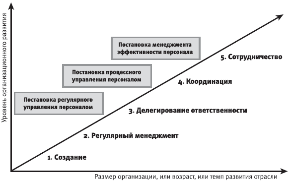 Существует несколько подходов к выделению стадий организационного развития. На рисунке 1.5.1 представлена взаимосвязь организационного развития и концепция управления человеческими ресурсами в привязке к идеям Л. Грейнера.