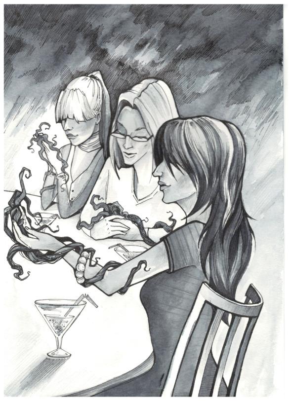 Зэ с легкой тревогой посмотрел на небо. Еще несколько минут и пойдет дождь. Терраса была открытой, но девушки не собирались перебираться внутрь. Они вполголоса бормотали слова, периодически поглядывая друг на друга. Зэ с удивлением обнаружил, что у зеркал вдруг появились темно-зеленые и коричневые отростки, которые шевелились…