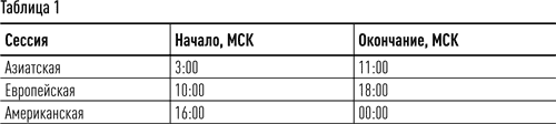 Хотя рынок и круглосуточный, на нем выделяют временные периоды, в течение которых наиболее активны банки из тех или иных регионов. По такому принципу работа рынка делится на азиатскую сессию, европейскую и американскую. Продолжительность различных сессий приведена в табл. 1.