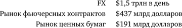 На данный момент FOREX является самым большим финансовым рынком и дает одну треть от совокупного объема всех финансовых операций в мире. Объем сделок, совершаемых на нем за сутки, составляет $3–5 трлн. Для сравнения: объем операций на крупнейшей в мире Нью-йоркской фондовой бирже — около $10 млрд. В 2000 г. объемы операций на FX и родственных финансовых рынках выглядели так: