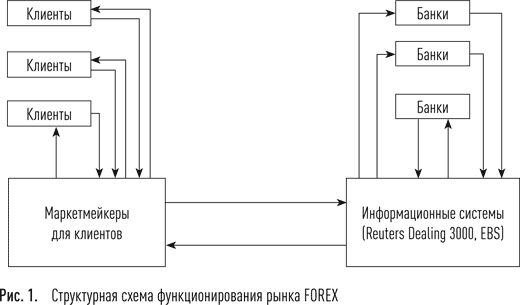 На рис. 1 представлена структурная схема функционирования рынка FX. Банки и крупные участники общаются между собой через Reuters Dealing 2000/3000 или EBS. Мелким клиентам нет необходимости авторизовываться в столь дорогих системах, и они торгуют через маркетмейкеров, которыми могут быть те же банки или брокерские конторы. В приведенной на рис. 1 схеме, маркетмейкеры авторизованы в информационных системах и являются полноценными участниками рынка. Они видят котировки других участников и могут осуществлять торговлю со многими участниками. Клиенты маркетмейкеров обычно могут торговать только со своим маркетмейкером, но для получения спекулятивного дохода этого вполне достаточно.