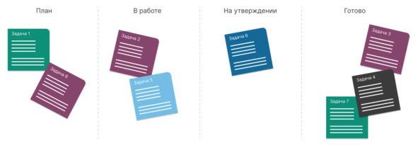 Другой пример — использование канбан-доски, которая тоже ничего не автоматизирует по умолчанию, но отлично визуализирует загрузку людей и позволяет перестроить рабочий процесс, выявлять узкие места и проблемные задачи, эффективнее работать с информацией и быть свободнее — работать за любым устройством с выходом в Интернет. При этом производительность команды порой вырастает на 40–50%.
