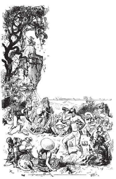 Четыре небольшие обезьянки различных размеров резвились в траве, мимоходом повисали на ниспадающих лианах и гонялись друг за дружкой по кокосовым пальмам под покровительственным взором родителей, особ весьма степенных, которые выказывали свою радость по случаю возвращения хорошей погоды лишь тем, что покачивали с видом совершенного спокойствия колышущимися плюмажами своих мягких мест.