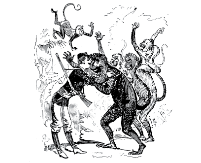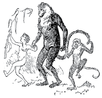 Эти обезьяны представляли собой переходный вид между орангутанами и понго; объединенные в трибы, они счастливо жили в своеобразных деревнях, состоявших примерно из пятидесяти хворостяных хижин каждая.