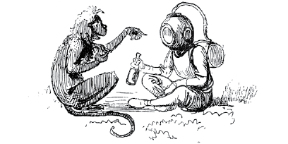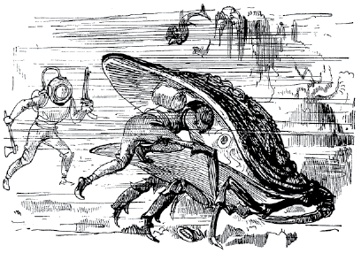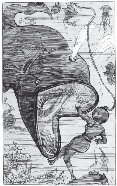 Когда он снова поднял голову, кит был отнюдь не мертв и уже не один: рядом с ним стояло странное существо! Протерев глаза, господин Крокнов констатировал, что этот самозванец есть не кто иной, как облаченный в скафандр водолаз!