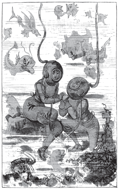 Молодые люди благополучно отошли на некоторое расстояние от берега — Фарандуль с помощью небольшого карманного устройства, сообщающего цифровые показатели давления, установил, что они находятся на глубине в сто пятьдесят метров, — когда внезапно их взорам предстало неожиданное зрелище!