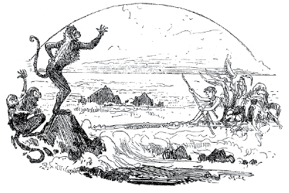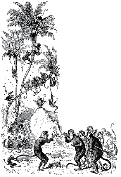 Внезапно это спокойствие было нарушено!.. Отец, при виде лежащего на пляже предмета, сделал два или три кульбита через голову, что у обезьян этих отдаленных краев означает грандиознейшее изумление; мать, не выпуская младенца, а вслед за ней и все их детеныши также совершили с полдюжины оборотов и, почти испуганные, упали на все четыре конечности!