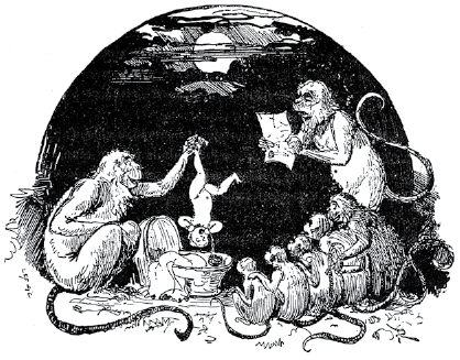 Наконец отец, приняв всевозможные меры предосторожности, чтобы не оказаться укушенным, осторожно вытащил продолжавшего жестикулировать потерпевшего кораблекрушение младенца из люльки за ногу и передал обезьяне; та смерила дитя долгим взглядом, определила рядом со своим младшеньким, сравнила, как следует поразмыслила и, многозначительно покачав головой, дала понять, что она находит эту новую расу обезьян значительно уступающей в красоте форм семейству орангутанов.