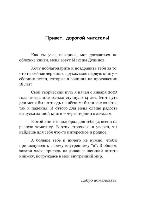 Хочу поблагодарить и поздравить тебя за то, что ты сейчас держишь в руках мою первую книгу — сборник песен, которые я сочинял на протяжении 18 лет!