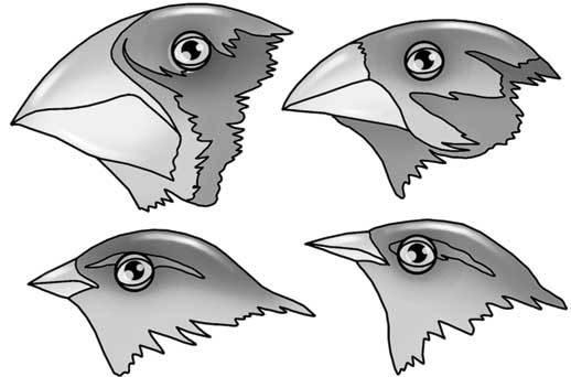 Острова архипелага раскиданы по океану. Условия на разных островах разные. И соответственно этим условиям, точнее говоря, подстраиваясь под эти условия, менялась жизнь. Например, небольшие птички одного и того же вида, жившие на разных островах, немного отличались друг от друга: у разных групп вьюрков были совершенно разные клювы, приспособленные для разной работы. Птицы, которые питались жестким кормом, например, семенами растений, имели «инструмент» именно для такой работы – крупный, мощный, сильный клюв. А те, которые приспособились питаться мягкими и сочными плодами кактусов, имели длинные и тонкие клювы, которыми удобно прокалывать оболочку и извлекать мякоть. Наконец, птички, предпочитавшие насекомых, имели острые, как у дятлов, клювы, приспособленные для выдалбливания и выковыривания пищи из-под древесной коры. Встречались и другие клювы, сделанные будто специально для другой пищи. Словно бы птички покупали свои клювы в магазине инструментов, сообразуясь с той работой, которую предстояло делать!