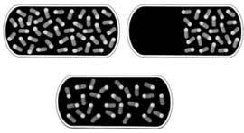 Или, допустим, есть баллон с газом. В нём мечутся с огромной скоростью молекулы газа, то есть его мельчайшие неделимые частички. Этих молекул в баллоне – триллионы триллионов, и у всех немного разнится скорость мельтешения и сильно разнится направление полёта – одни туда летят, другие сюда… Молекулы постоянно сталкиваются друг с другом, как бильярдные шарики, отскакивают и разлетаются, чтобы через долю секунды снова столкнуться с другими шариками, разлететься, столкнуться… Вечное беспорядочное движение. Именно его мы наблюдаем ниже на картинке слева. Как вы думаете, велика ли вероятность того, что все молекулы соберутся в одной половине баллона? Или на какое-то мгновение вдруг выстроятся сколько-нибудь организованно?
