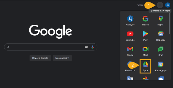 Как только вы зашли в свой аккаунт Google, вы можете попасть на Диск со страницы Google.com или из других приложений Google — для этого достаточно нажать на кнопку «Приложения Google» в правом верхнем углу и выбрать «Диск»: