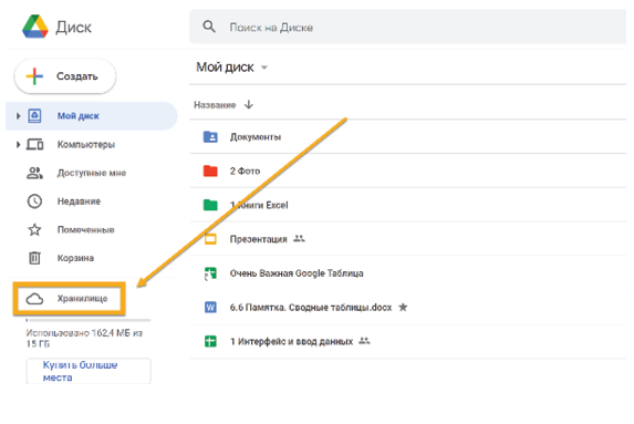 Чтобы посмотреть, какие файлы на Диске занимают больше всего места, нажмите «Хранилище» (Storage). По умолчанию список отсортирован по убыванию, то есть самые «тяжелые» файлы будут наверху.