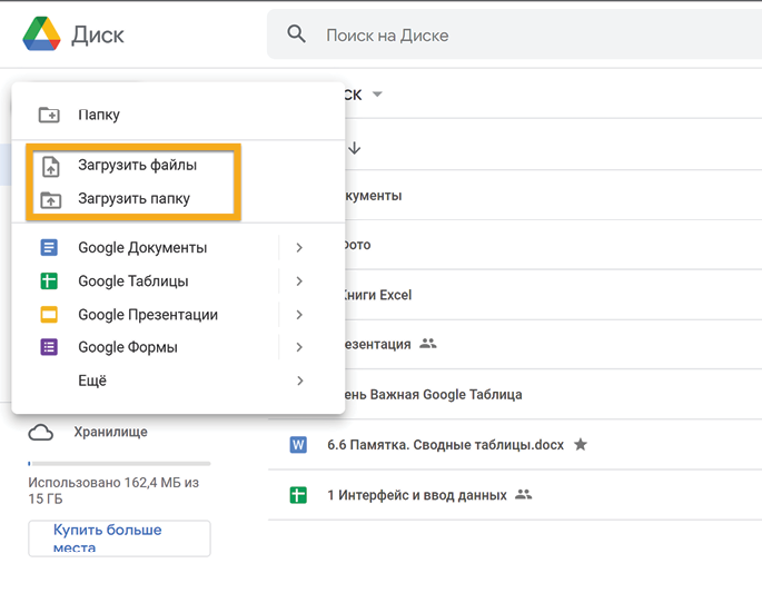 Интерфейс Google Диска. Загрузка файлов и папок. Поиск на Диске