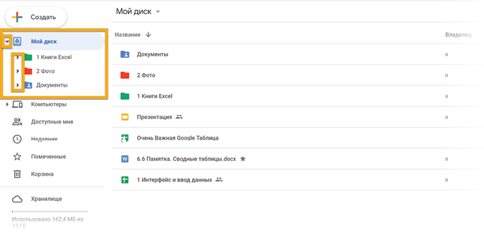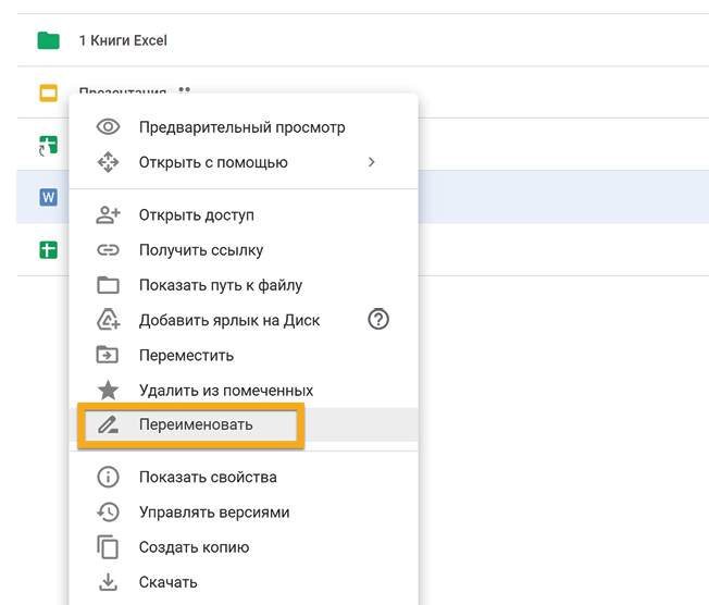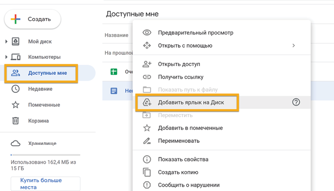 Если вы хотите видеть файл из раздела «Доступные мне» у себя на Диске, создайте ярлык — достаточно щелкнуть по документу правой кнопкой мыши и выбрать пункт в меню «Добавить ярлык на Диск» (Add shortcut to Drive):