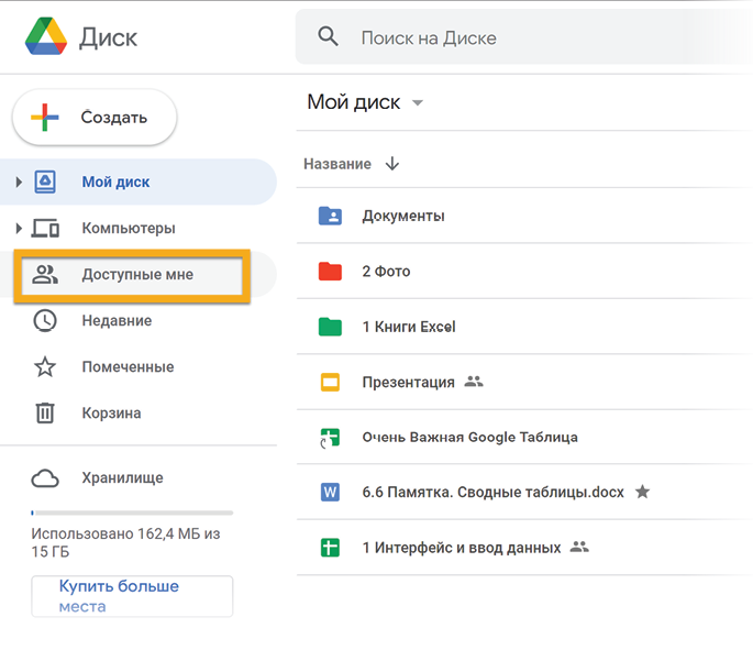 Файлы, которые хранятся на чужих Google Дисках и к которым их владельцы (те, кто загрузил файлы на Диск или создал в редакторах Google) открыли вам доступ, можно просмотреть в разделе «Доступные мне» (Shared with me):