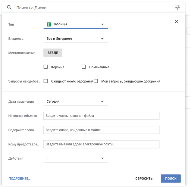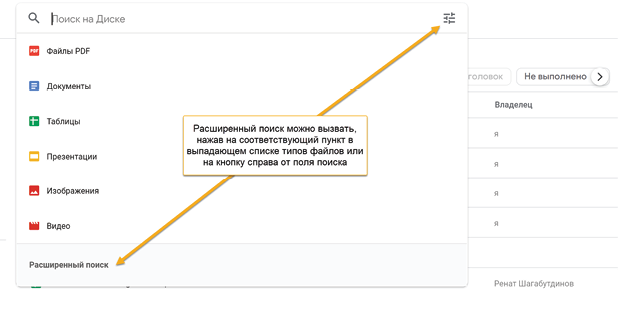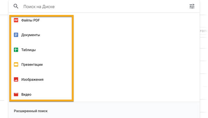 Поиск на Диске по умолчанию ведется как по названиям файлов, так и по их содержимому. Можно ограничить поиск типом файлов, если выбрать соответствующий в выпадающем списке, который появится по щелчку на поле поиска: