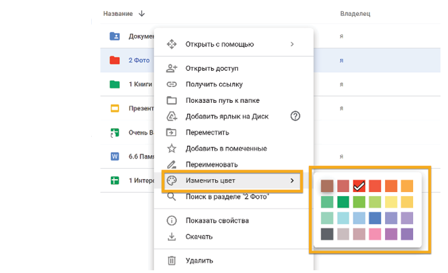 Цвет папок можно менять — в контекстном меню по щелчку правой кнопкой мыши на папке («Изменить цвет» / Change colour):