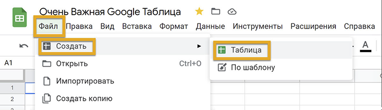 А также из существующего документа/таблицы/презентации в меню «Файл» (File):